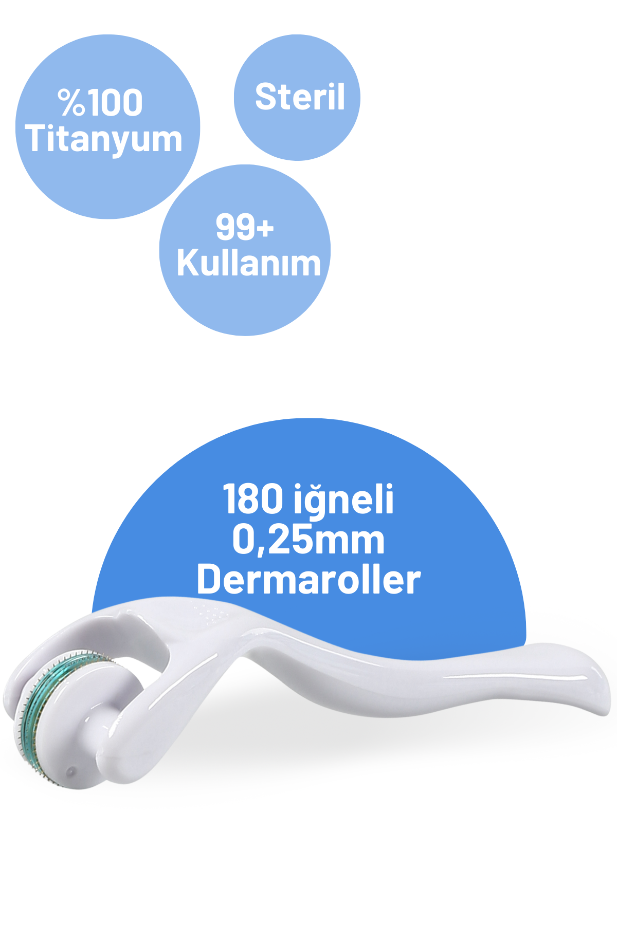 Dermapolin Dermaroller her biri 0,25mm boyunda 180 adet micro iğne içerir. İğneler orjinal titanyum ve Antialerjeniktir.